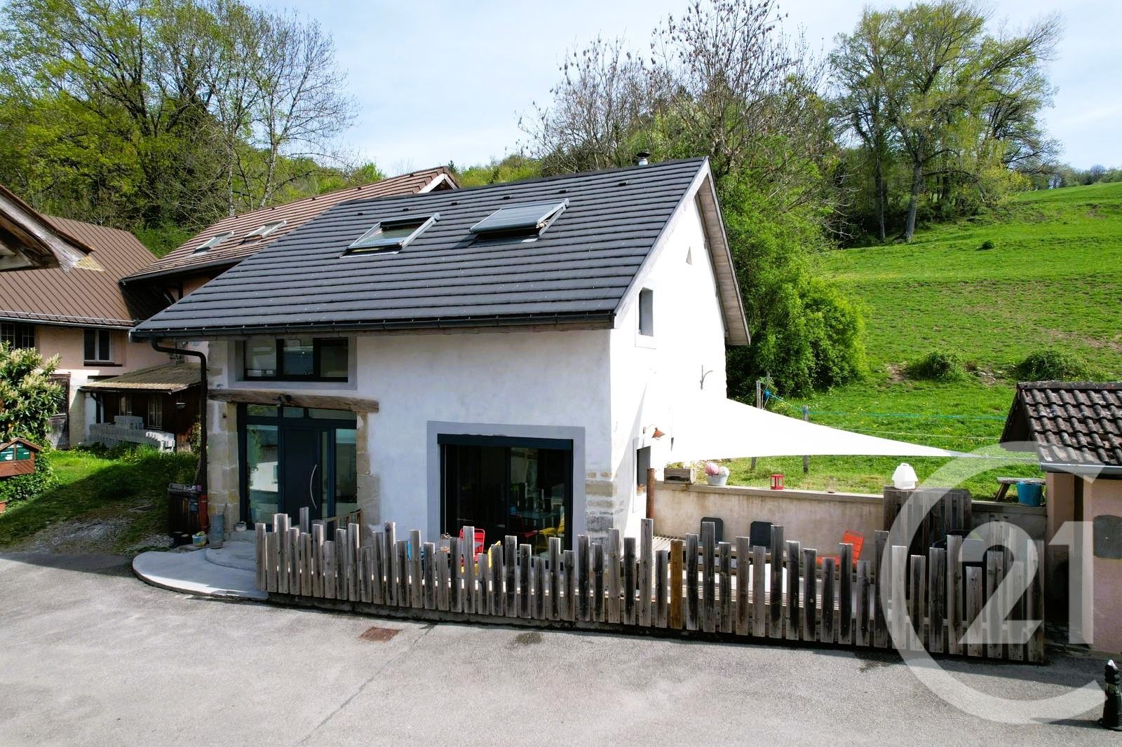 Vous profiterez d'un garage, de trois places de parking et d'une grande cave. Il faudra juste traverser la petite route et profiter de la belle pelouse soigneusement entretenue.